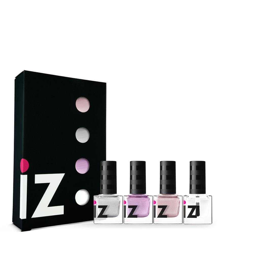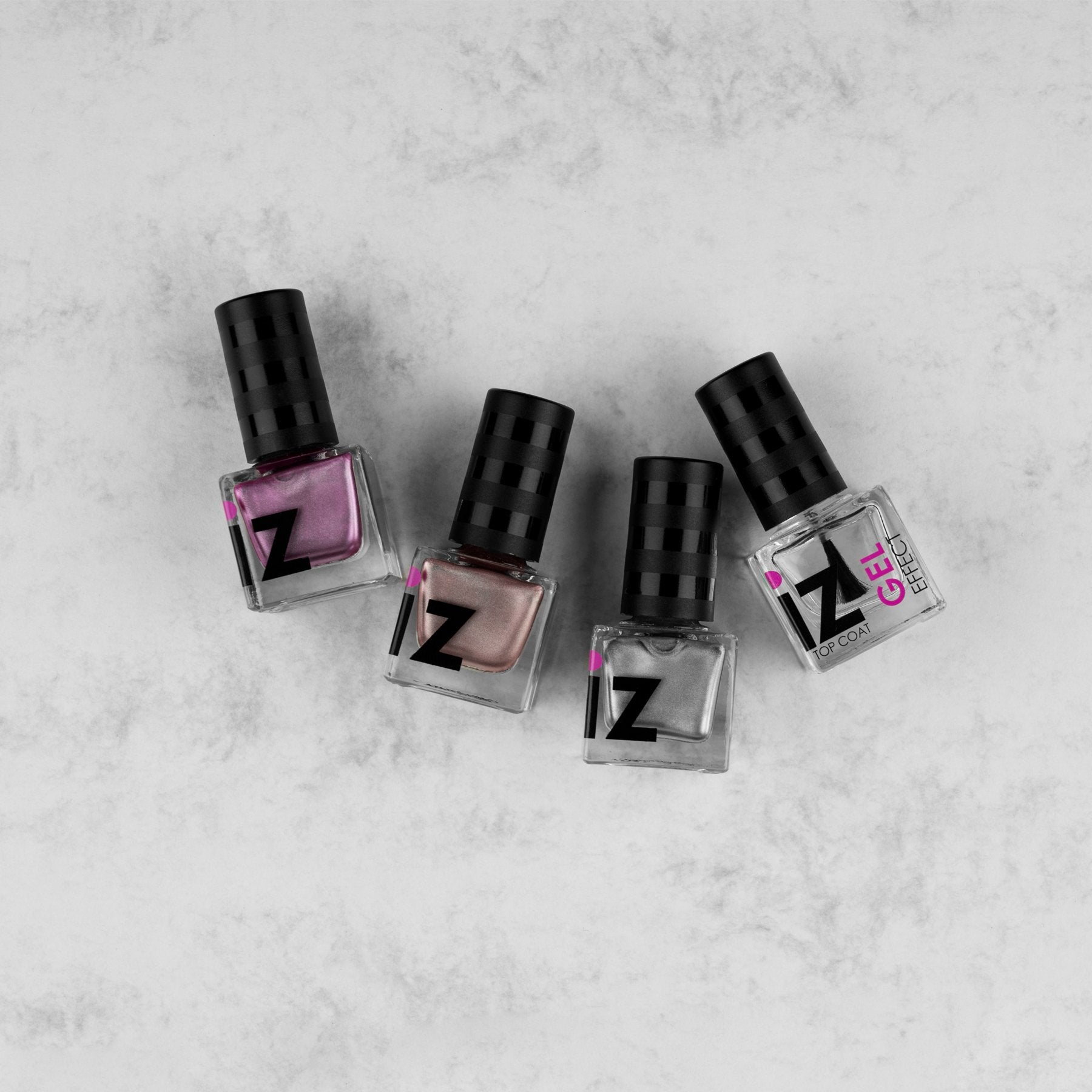 Ball Gown, Mirror Ball and Pink Fizz nail polishes, with a Gel Effect Top Coat, in a FREE soft touch gift box.